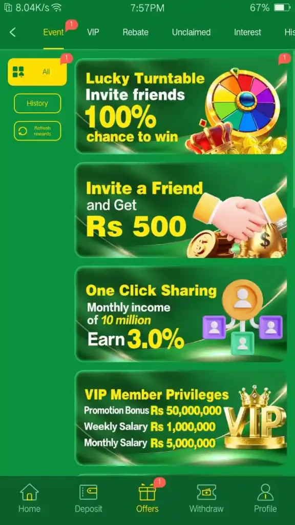 The Refer & Earn feature is one of the easiest ways to earn extra rewards. Share your referral link with friends and family. When they join using your link and start playing, you automatically get bonuses and cashback.