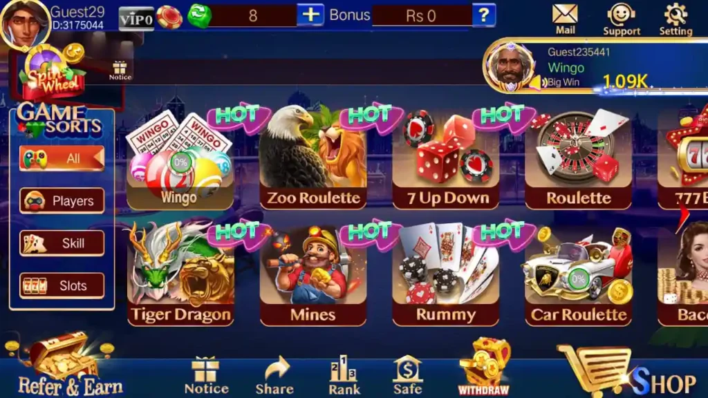 Casino games like Baccarat, Ander Bihar, Car Roulette, Crash